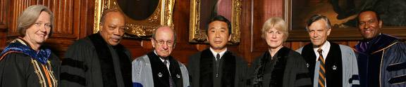 Honorary degree recipients pictured with President Shirley M. Tilghman (left) and University Orator Terdema Ussery (right) were: (from second from left) Quincy Jones, George Kateb, Haruki Murakami, Mary-Claire King and John Waterbury. (Photo: Brian Wilson)