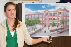 Weissinger explains how her class evaluated the building's environmental footprint during a presentation to officials from Isles and the firm contracted to remodel the factory. (Photo: Chris Emery)