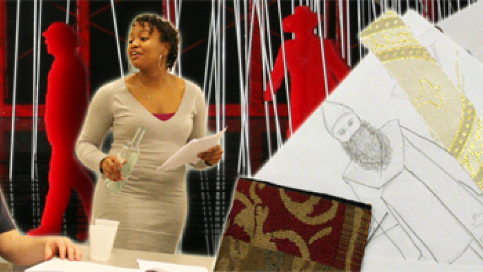 Kelsey Berry (left), a member of the class of 2010, and Jennie Scholick (center), a 2009 graduate who choreographed the action-packed production, join Schram and Schwall in the ensemble. (Photo: Brian Wilson)