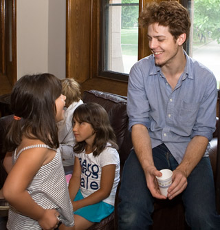 Sprawled across the floor with the children, Strand helped a student figure out how her character -- a shy girl who wants to learn how to dance -- might behave at the disco.