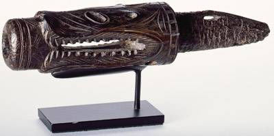 This harpoon socket piece, carved as a predator, is believed to be from St. Lawrence Island in the Bering Sea, just south of the Bering Strait.