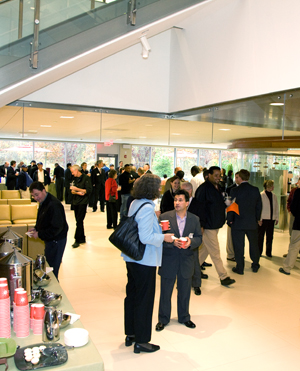 University employees and guests gathered in the lobby of 701 Carnegie Center during the open house.