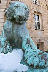 • Princeton's class of 1879 donated the stately bronze tigers guarding the entrance of the University's landmark Nassau Hall, which was built in 1756. The tigers were installed in 1911. Visitors frequently can be found sitting on the sculptures to gain a tiger's eye view of the front campus and FitzRandolph Gate, the University's main entrance.