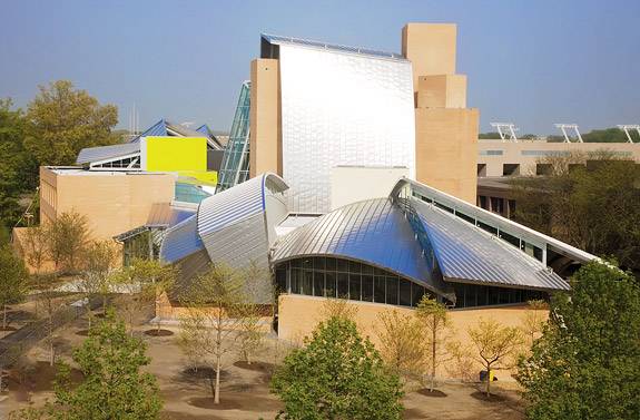 "Like an Igor Stravinsky composition for ballet, counterpoint and contradiction dominate the exterior: saw-toothed rooflines are juxtaposed against sloping steel profiles and brick boxes; soaring towers confront horizontal rooms; shiny steel embraces light-color brick," Cotton writes of the Gehry Partners-designed Lewis Library.