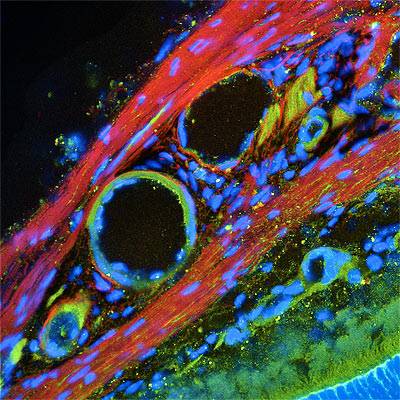 This image of a frozen section of a mouse eye, titled "Powering the Eye," shows connective tissue, blood vessels, sclera (the white part of the eye) and part of the retina. The green parts of this image are the calcium-binding protein Calretinin, which have been stained with an antibody. Cell nuclei are blue. The image was taken by graduate student Praveena Joseph-de Saram and Associate Professor Michael Berry of the Department of Molecular Biology.