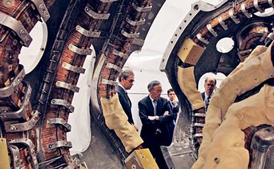 Chu (center) receives an explanation of the components of PPPL's National Compact Stellarator Experiment during a lab tour with Neilson (left) and Prager. The stellarator is a type of fusion experiment.