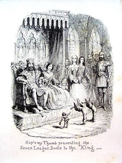 Hop'o my Thumb presents the Seven League Boots to the king in this plate from George Cruikshank's 1853 printing. Blog: Cruikshank's fairy tales