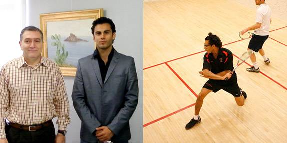 Left: David Peña (right) during an internship at the Mexican embassy in Madrid, alongside Ernesto Sosa Gallegos (left), a counselor in the political affairs division. Right: Squash player David Peña. (Photo at left courtesy of David Peña; photo at right by Beverly Schaefer)