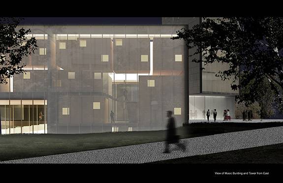 The three-story Music Building will contain a performance and rehearsal space, acoustically advanced practice rooms and teaching studios, and a digital recording studio.