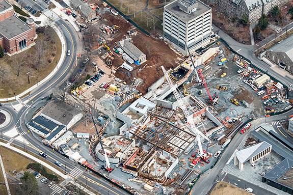 This aerial shot shows progress on the arts complex construction site as of mid-March. The footprint for the Music Building can be seen taking shape just to the left of the triangular roof of the new transit station, with the Tower on the opposite side of the site. The Wallace Dance Building and Theater, including its distinctive curved wall, is closer to Alexander Street, which is at the bottom of the photo. New South is at the top of the image, with the McCarter Theatre Center at left. (Photo by Aerial Photos of New Jersey)