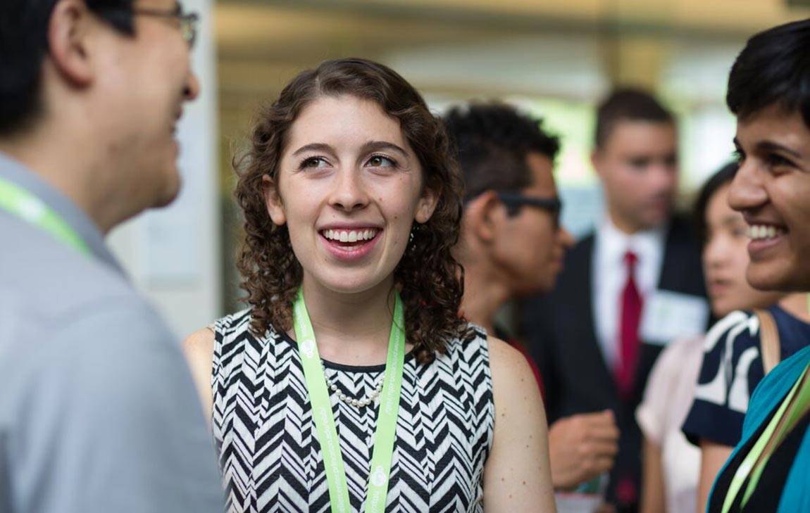 Hannah Miller, center, has participated in several Keller Center programs including serving on the center's student advisory board and finding an internship with a startup company. Here she talks with fellow students at Keller's eLab Demo Day in 2014. (Photo by Victoria Sulewski/Fotobuddy for the Office of Engineering Communications)