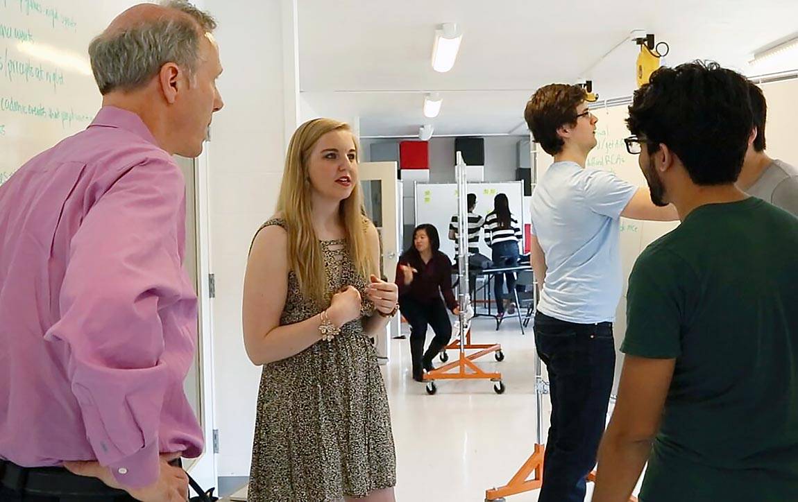 Jenna Rodrigues, center, who graduated in 2014, credits the class "Creativity, Innovation and Design" with changing her outlook toward solving problems and inspiring her to help bring new types of thinking into the educational system. The class is taught by Derek Lidow, left, who is part of the entrepreneurship faculty at the Keller Center. (Photo by Danielle Alio, Office of Communications)
