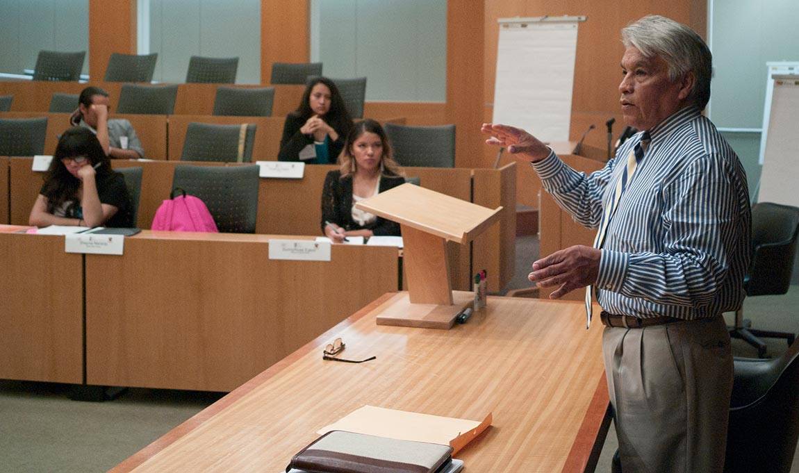 Regis Pecos, a member of Princeton's Class of 1977 and co-director and co-founder of the Summer Policy Academy, addresses the program's 18 participants, who come from 16 Pueblo Nations in New Mexico and the Navajo Nation in Arizona.