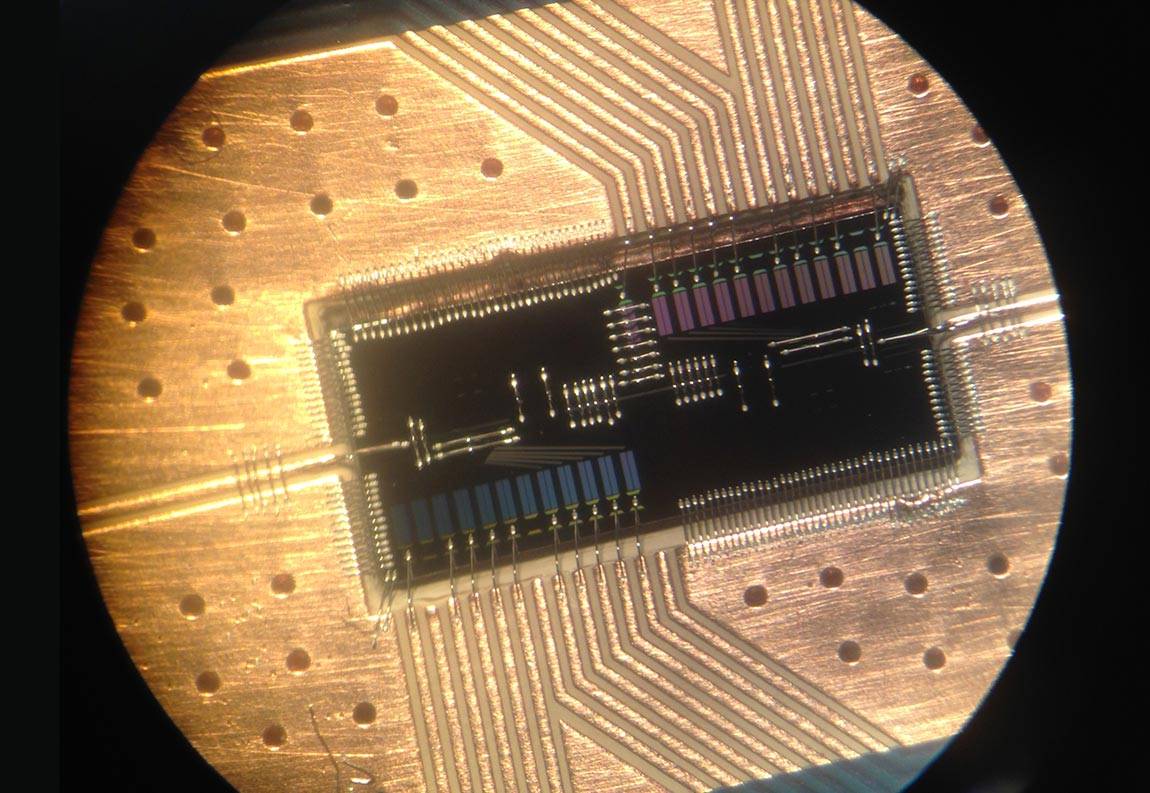 A fully packaged device for trapping and manipulating single electrons and photons. A series of on-chip electrodes (lower left and upper right) lead to the formation of a double quantum dot that confines a single electron below the surface of the chip. The photon, which is free to move within the full 7-millimeter span of the cavity, exchanges quantum information with the electron inside the double quantum dot. (Photo courtesy of the Jason Petta research group, Department of Physics)