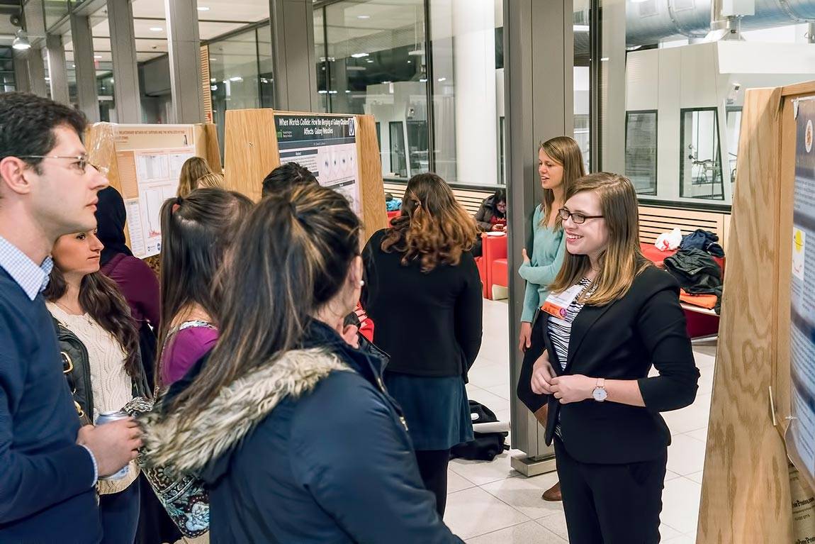 Undergraduates present their research at a poster session at Frick Chemistry Laboratory.