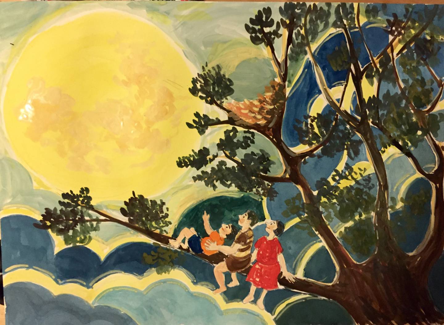 She also paints pictures to express her hopes that they will soon be reunited. In one, they sit with their son during the Chinese Mid-Autumn Festival and gaze at the full moon. These paintings make her feel closer to her husband.