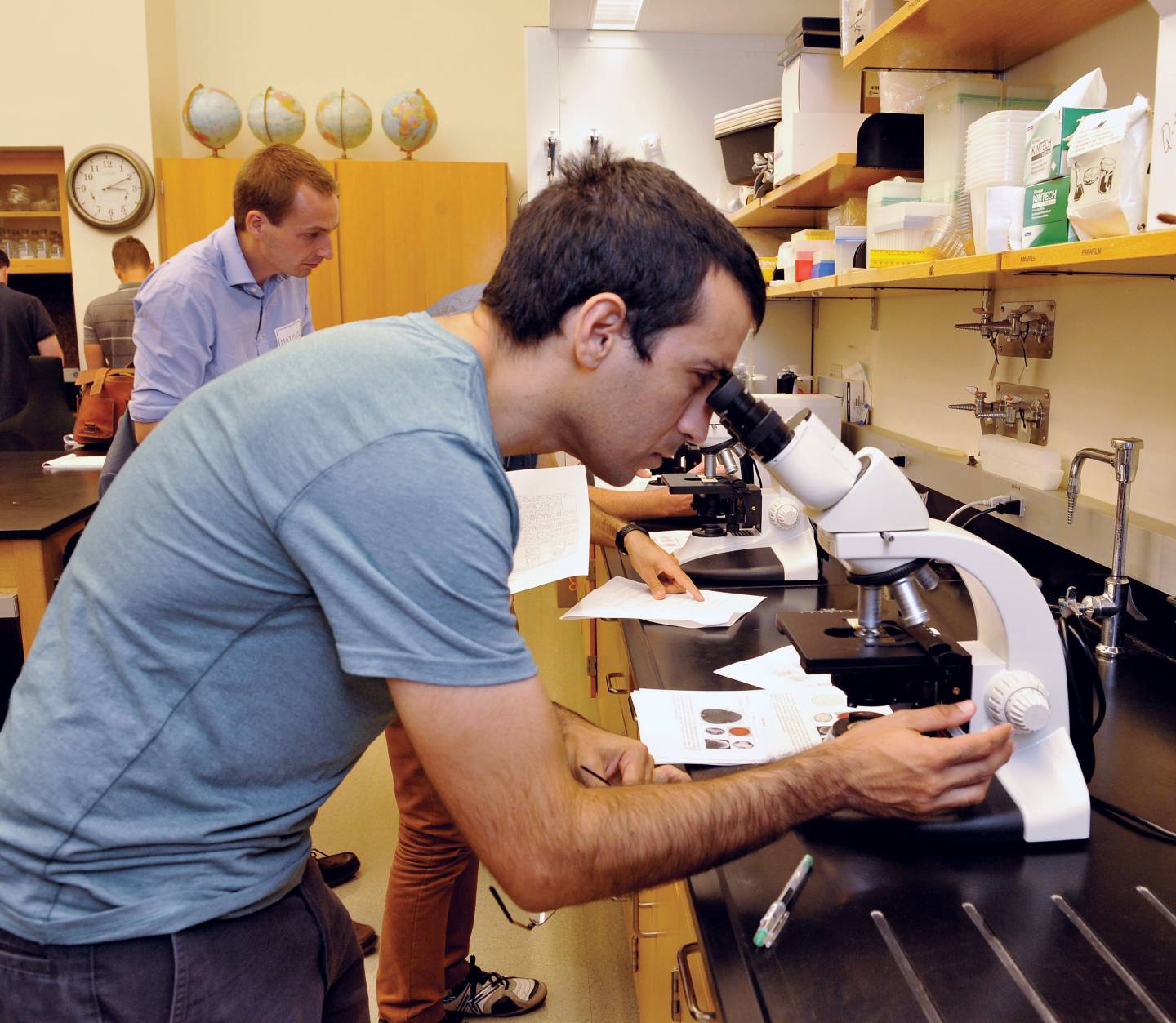 Mordechai examines pollen grains at a CCHRI palynology workshop in 2016, where historians learned how to use pollen data in their own research.