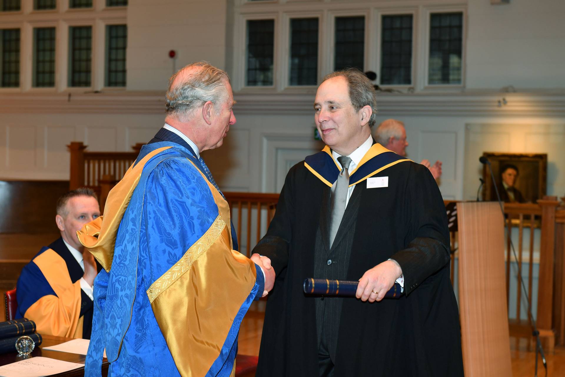 Prince Charles, left, confers honorary membership of the Royal College of Music to Michael Pratt, conductor of the Princeton University Orchestra and director of the Program in Musical Performance, at a ceremony March 14 in London.