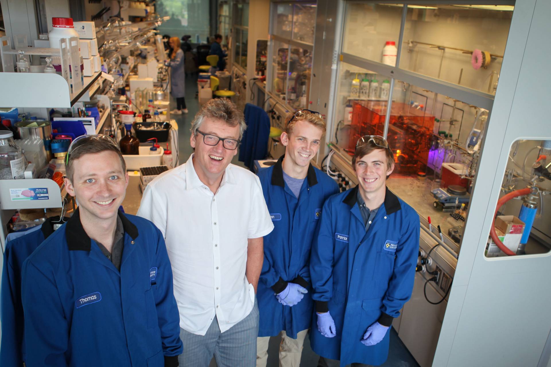 Princeton researchers have found ways to bond molecules "like Legos,” theoretically allowing new medicines to be assembled faster and with more flexibility. The research team includes (from left): postdoctoral research associate Thomas Brewer; David MacMillan, the James S. McDonnell Distinguished University Professor of Chemistry; and graduate students Ian Perry and Patrick Sarver.