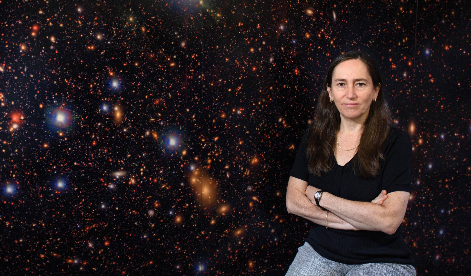 Outside Eve Ostriker’s office door stretches the universe, dotted with orange galaxies against the black backdrop of space.
