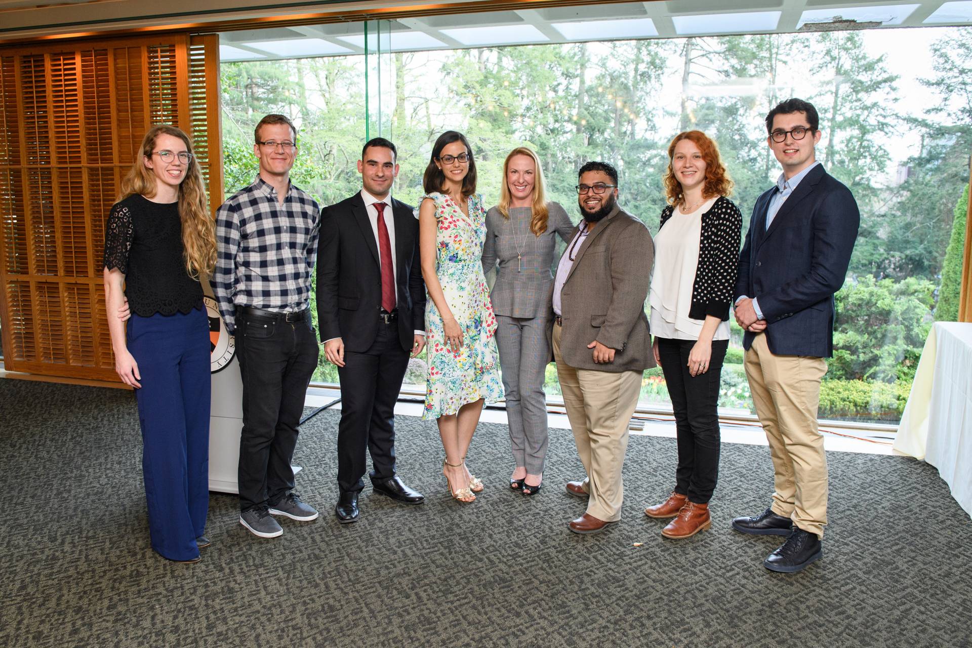 The Graduate School has honored seven graduate students with its annual teaching awards in recognition of their outstanding abilities as teachers. Pictured from left to right are Emma Kast, Mattias Fitzpatrick, David Villalobos-Paz, Laura Leal, Dean of the Graduate School Sarah-Jane Leslie, Wasim Shiliwala, Elena Dugan and George Sorg-Langhans.