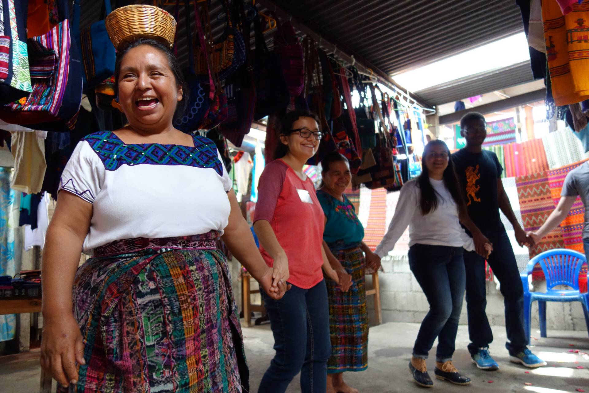 Students and faculty member Christina Lee traveled to Guatemala for the course “Identity in the Hispanic World” and captured photos and thoughts about the experience, which follow. In this photo: After women at a weaving co-op demonstrated how they create their textile art, they showed us a traditional Kaqchikel dance from Santiago de Zamora and invited us to dance with them. A couple of the women had baskets, which contained flower petals. They scattered these petals on the floor and on some of our classmates. This moment was filled with smiles and laughter for everyone at the cooperative.