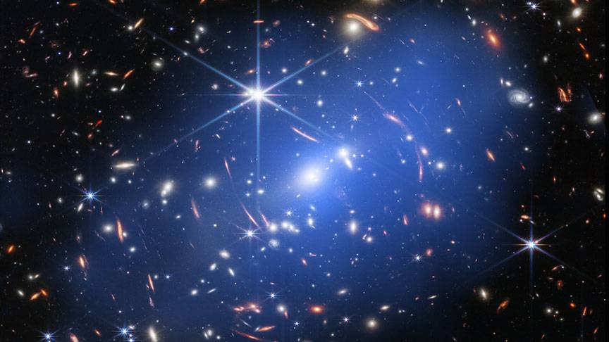 An image from the James Webb Space Telescope of a galaxy cluster named “SMACS 0723.3Ð7327.” Galaxy clusters form near enormous knots of dark matter, the strange stuff that holds the material universe together. The gravity of these dark matter knots pulls together an enormous amount of regular matter, too, which eventually forms bright galaxies and stars.