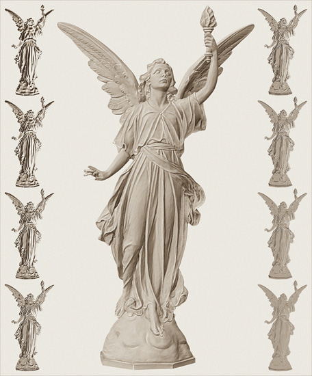 The image at center is generated from a 3D model, which was created using a “3D scanner” that can capture the shape of real objects. The small images result from an analysis of different scales of geometric detail of this 3D shape. These are combined to form the image at center, which attempts to balance shading and bring out surface detail at all scales.