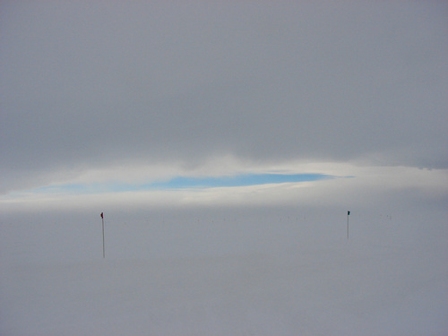 This photograph was taken in the middle of a rough snowstorm in a field near McMurdo Station, Antarctica. With low visibility and strong winds whipping words out of earshot, a colored flag is the only guide on the Antarctic ice. Red and green indicates "okay to pass"; black indicates a crevasse. Out here, life depends on simple, critical designs.
