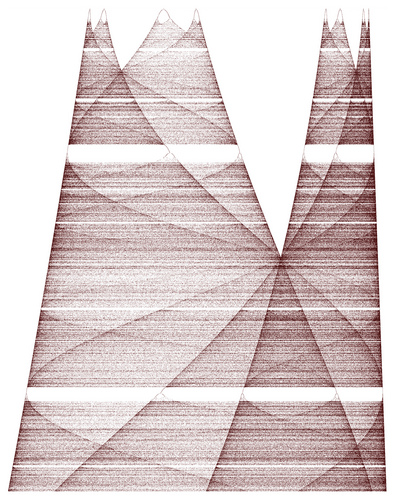 This is an excerpt from the bifurcation diagram of a logistic map. This logistic map models population dynamics with reproduction and limited resources, and it is often used as an example of a phenomenon known as "the period-doubling route to chaos." Typical of chaos, many regions in the figure exhibit self-similarity. This picturesque landscape reflects the order that emerges out of chaos.