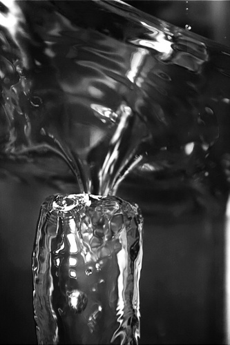 The dynamics of the bubbles and splashes produced by a ball impacting water change dramatically when the force due to gravity is removed, leaving the only remaining driving forces: surface tension and inertia. A still shot from an experiment designed to investigate such a phenomenon shows that the bubble formed underneath the water's surface expands rapidly and forms a jet, while the water above the surface gently floats away. Here the ball bounces off the bottom of the tank through the ever growing bubble.