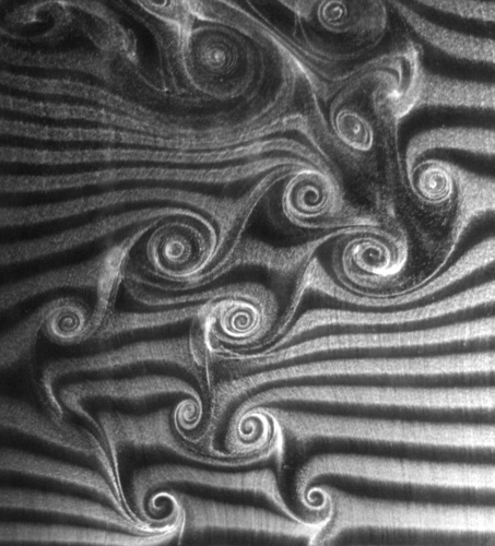 For this image, two artificial fish fins are placed side-by-side and flapped in-phase with each another as water flows past the fins (flow direction is up). Small hydrogen bubbles (the white part of the image) allow for the wake of the fins to be visualized. The interaction of the fins creates two repeating patterns of swirling vortices known as vortex streets.