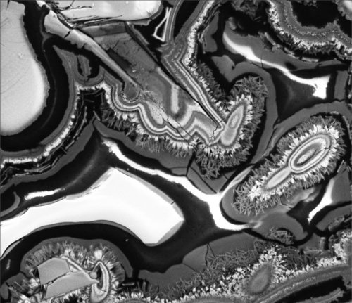 This column was packed with Hanford sand, then reacted with simulated tank waste. After the reaction, the column was sectioned and imaged using Scanning Electron Microscopy (SEM) Backscattered Electron (BSE) imaging. This particular image shows the inside of one of the sand grains where -- long before the experiment -- natural reactions precipitated minerals in an intricate layered pattern. The different shades of gray correspond to different minerals.