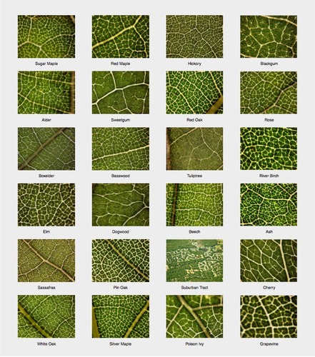 Leaves carry out photosynthesis in clusters of cells locally serviced by end-units of pipes that deliver water and take away sugar. The cells must be within diffusion distance of pores to exchange carbon dioxide and oxygen. Diffusion may set an upper limit on the size of an efficient cluster, and quasi-fractal branching of pipelines may set a lower limit. Accordingly, many species of local woody plants show photosynthetic clusters of approximately uniform size, and these clusters themselves group hierarchically into neighborhoods of successively larger sizes. The photo fields are 4 millimeters wide, except for the aerial photo of human neighborhoods.