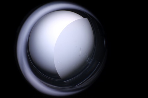 This image of a droplet containing copper chloride was taken with visible light through a laboratory dissecting microscope. Look closely and you will see what appears to be a scratch on that droplet. This is actually a C. elegans worm floating motionlessly, paralyzed by the chemicals of its environment. In this state, the worm's straightened body can be measured for growth more effectively. Despite its slight 1 millimeter-long body, the C. elegans worm contains vast amounts of genetic potential and can be thoroughly studied to better understand other organisms that exist on a much larger biological scale.