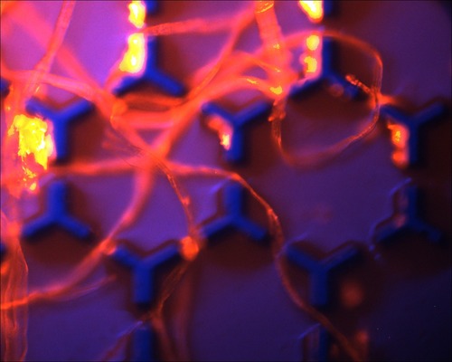 This image, captured with an epifluorescence microscope, shows neural pathways known as "fiber tracts" that are trapped on hexagonal microstructures made of silicon. The fiber tracts light up in a violent red as soon as they absorb the doxorubicin molecules.