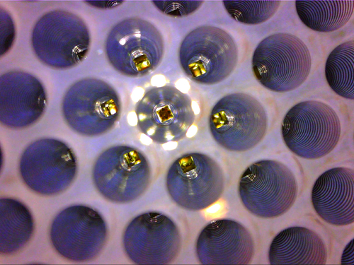 This photograph looks down into feedhorns, small corrugated structures that allow particles of light to funnel toward the antennas. The antennas are tiny dark triangles suspended upon a thin membrane on a silicon detector wafer that attaches to the base of each feedhorn. The membrane is thin enough that you can see the gold-plated reflective wafer behind the antennas. Light from the camera is reflecting off the gold-plated wafer, casting a golden gleam.