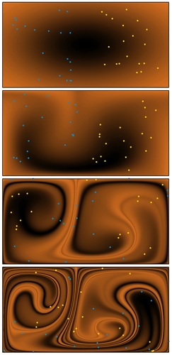 This sequence of images shows the evolution (top to bottom) of a theoretical oil spill. The black blob in the top figure represents the oil as it likely spread during the initial spill. The oil is then transported and mixed by two large opposite rotating structures called gyres. This 'stirring' leads to fine and intricate structures as the oil and water mix (bottom figure). In contrast to the oil (black) and water (orange), which swirl in complicated patterns, the blue and yellow "tracers" are transported randomly.