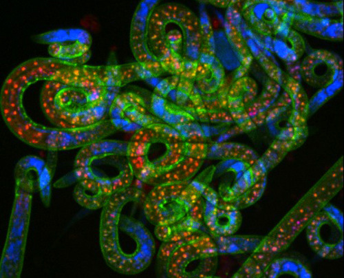 This bright clump of worms resembles the wild snakes that surrounded the head of the mythological sea monster Medusa. But unlike Medusa's snakes, these worms became sticky and connected during an experiment designed to understand how molecules determine cell and organism size. C. elegans worms have a transparent nature that makes them ideal for fluorescence microscopy. This single image captures all levels of the central dogma of biology: DNA (stained in blue) and pre-processed ribosomal RNA (stained in red), while the worms are a transgenic line with fib1::gfp protein (in green).
