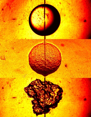 These three images are snapshots of a spark-ignited expanding flame in different environments of the same hydrogen-air mixture. The top flame shows the ideal, reference case of a stable, smooth flame surface in a quiescent environment at atmospheric pressure. The middle flame is taken under elevated pressure simulating that within an internal combustion engine. The bottom flame is taken in a highly turbulent environment simulating another aspect of the engine interior. All images were taken at 8000 frames per second, using schlieren photography. The radius of the top flame is 11.4 millimeters.