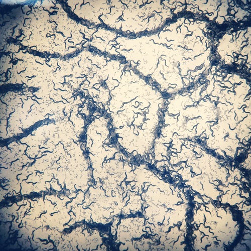 Caenorhabditis elegans (C. elegans) worms are stored on agar plates covered with a lawn of E. coli bacteria as their food source. Sometimes when the C. elegans have consumed all of the bacteria, they begin to clump together as seen in this image. I found the pattern on this plate particularly lovely, and was able to capture it with my cell phone by holding the lens of my phone's camera up to the microscope eyepiece. I've since shared the photo on social networking sites and have had friends who've never been interested in biology ask me more about my work because of this photo. To me, this image represents the simple pleasure of finding something beautiful when you don't expect to, and it shows how easy it is to connect science with new audiences by simply clicking 'share.'