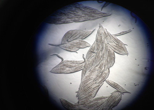 For my senior thesis work, I have done many chemotaxis assays with C. elegans worms. This involves training the worms to associate food with a smell, and seeing if the worms will learn and remember to crawl to the smell when there is no food present. A paralyzing agent is needed to keep the worms at the odorant site for imaging. Sodium azide is the paralyzing agent in this case; this chemical makes the worms, which usually move in a lovely sinusoidal fashion, go stick-straight and stop moving. In this case, the worms not only went straight but stayed connected, weaving together to look like the leaves of a flower.