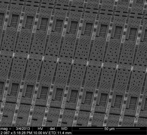 Photolithography "printing with light" is an invention of the 20th century in which engineers selectively expose a photo-reactive "photoresist" with patterns of light; wherever the resist is exposed it can be chemically etched away (positive resists), or vice versa (negative resists). Photolithography is what makes it possible for engineers to design tiny planar electronic structures hundreds of times smaller than the width of a human hair, giving rise to computer microchips. Here we observe the state of the art in the design of these tiny electronic structures, which taper a thin layer of metal on silicon into narrow bottlenecks, creating channels for liquid helium to fill. Electrons floating on helium in the channel should pass through each bottleneck one at a time -- much as a subway turnstile allows only one person to pass through at a time.