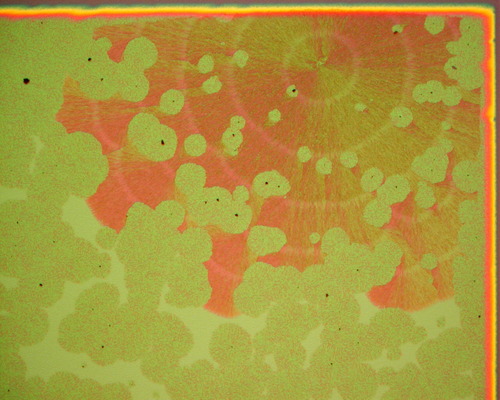 Amorphous films of contorted hexabenzocoronene form two visually different types of crystals when annealed at 240 degrees Celsius. This sample was part of an experiment analyzing how crystals grow within a film. To track growth rates, crystallization was halted every minute, resulting in the concentric ring pattern in the large crystal. As the large crystal grew, it trapped a few of the smaller ones in its path, resulting in the varying diameters of small crystals within the large one.