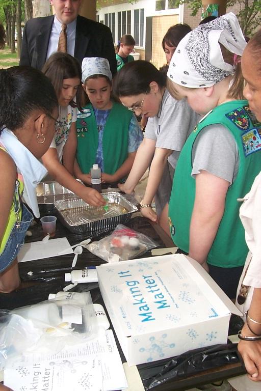 The Executive Director of AIChE, John Sofranko, unveiled the new kits on May 5 with the Girl Scouts last Saturday at Community Park School in Princeton, NJ. This was a fun and exciting turnout which involved a grassroots effort working with the 22 Girl Scouts from 9 different troops, their leaders and parents, student volunteers, staff members, and even Congressman Rush Holt participated in the hands-on segment to demonstrate the kits.