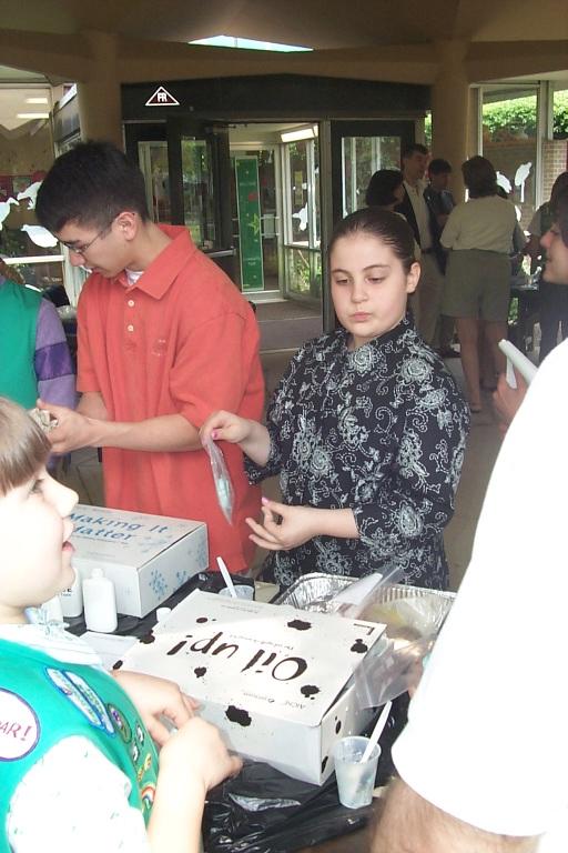 Kathleen Miranda showing the girl scouts how oil can be contained with floating booms and then cleaned up with adsorbents. |