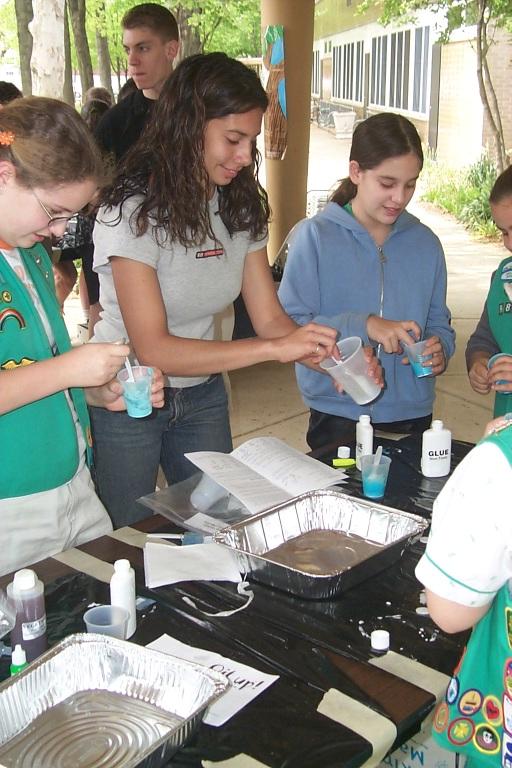 Shravi Reddy helping the girl scouts mix up Elmers glue with Boric acid to form a polymer gel. The girls added some blue food coloring to provide some color to their polymer. |
