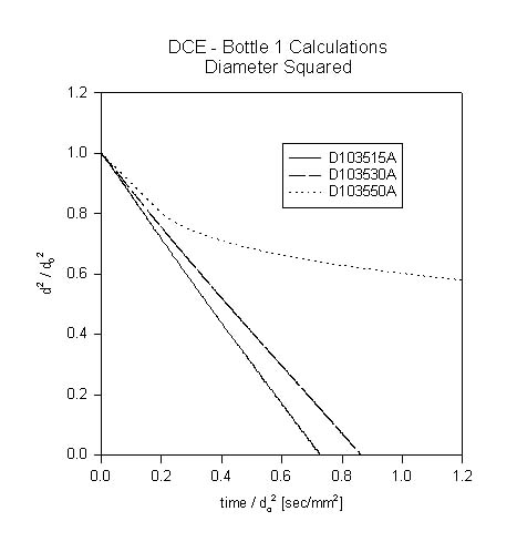 The following is a plot of diameter-sqaured vs. normalized time for Bottle 1 test cases D103515A, D103530A, and D103550A.