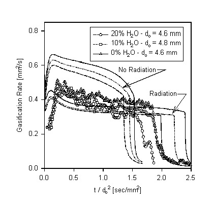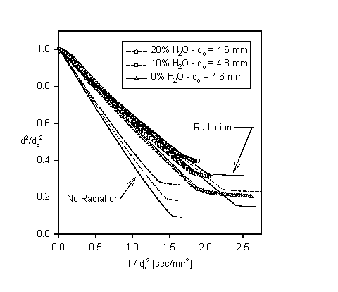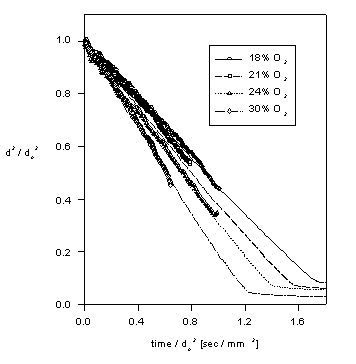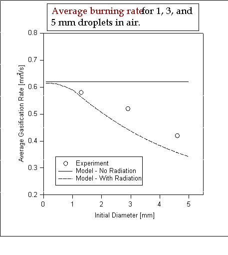 Prior to adding the radiation effects to the model, calculations were compared extensively with numerous experiments performed in the 2.2 second drop tower at NASA-Lewis. Shown above right, are comparisons with experimental burning rate for several different levels of oxygen in the surrounding nitrogen (at one atmosphere pressure).