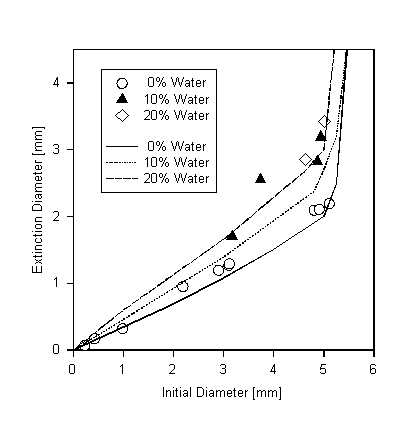 An important effect that has never been observed with such precision on the ground is the so-called "extinction" of the flame surrounding the drop, leaving an unburned liquid drop. The "extinction" diameter of the droplets were very large in these experiments, exceeding the initial size of droplets in ground-based experiments. The extinction diameter was estimated by determining the diameter when the fiber glow ceased, and also from a change in the rate of decay of droplet size with time. Both techniques yield relatively the same value. The extinction diameter data obtained for methanol are shown below.